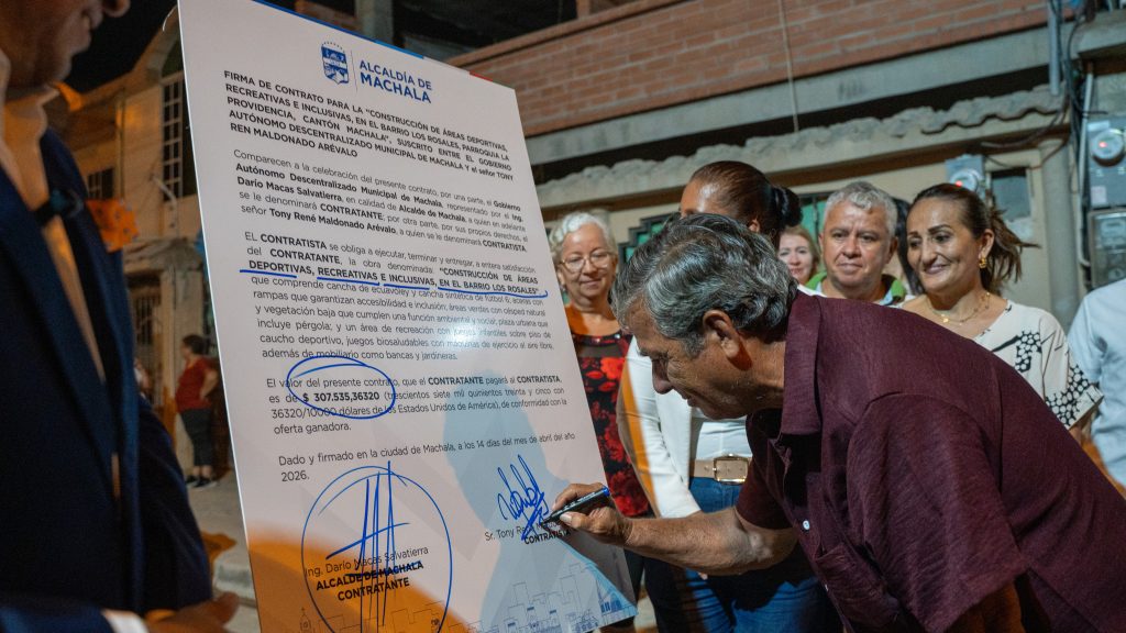 El alcalde de Machala, Darío Macas Salvatierra, realizó la firma simbólica en el sector Los Rosales para la construcción de nuevas áreas deportivas, recreativas e inclusivas, una obra orientada al bienestar y la integración de la comunidad.
